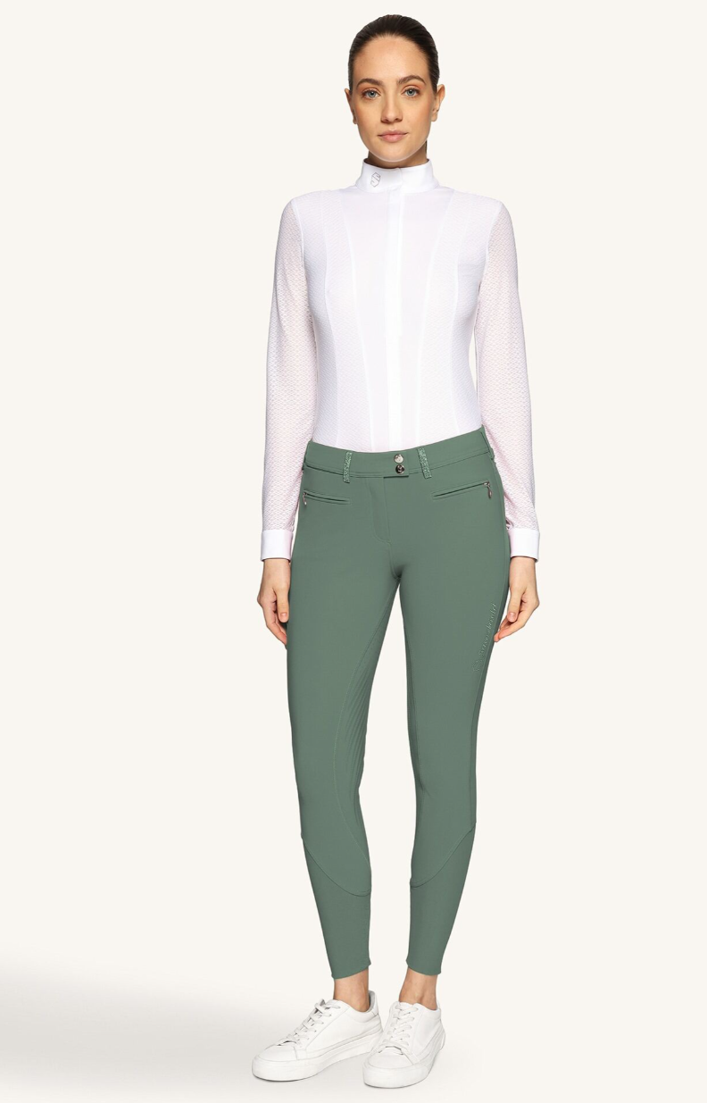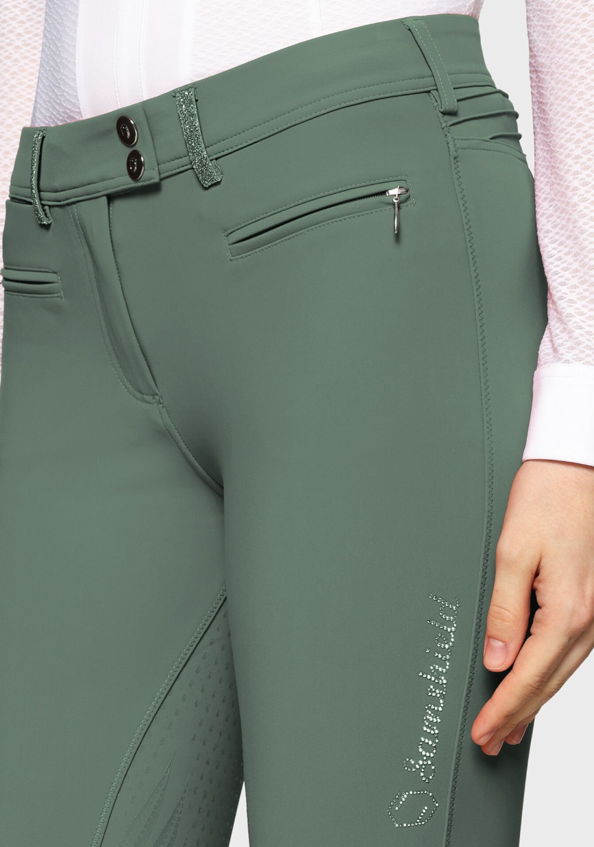 Samshield's most popular breech, the Adele/Diane Breeches are detailed with hand set Swarovski detailing, Swarovski Crystal Fabric and exceptional embroidery. Made from 4 way stretch fabric with wrinkle free technology, comfort and style are paramount in this design. The fabric is enhanced by handmade six layer grip, wearing like a car tyre and features body temperature regulating technology wicks moisture away and keeps the skin dry to keep you comfortable. These breeches are also EPD Certified, making them environmentally friendly. Additional features include a hidden phone pocket, compressive calf area for increased blood flow and muscle support and an inner elastic panel on the waistband to keep your shirt in place. Easy care, machine washable at 30'C